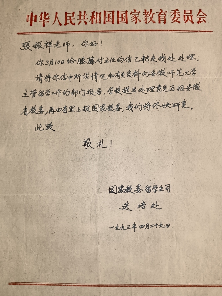 1993 我的博士论文片断陆续在国际刊物发表,国内课题也已完成预定计划. 3月10日 给国家教委写信汇报我所学